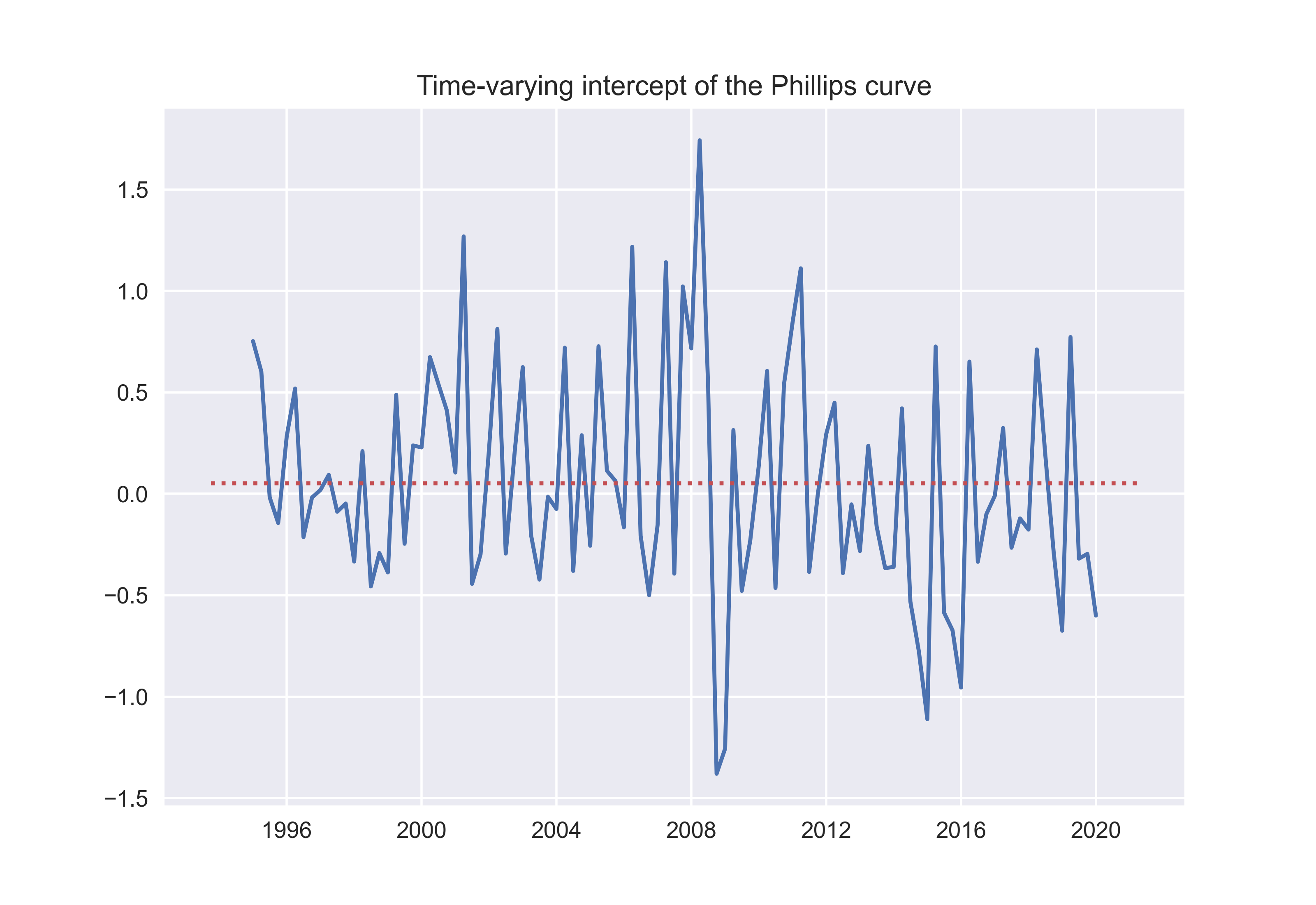 The next figure displays the time-varying intercept of the Phillips curve that we have seen is simply the global factor: