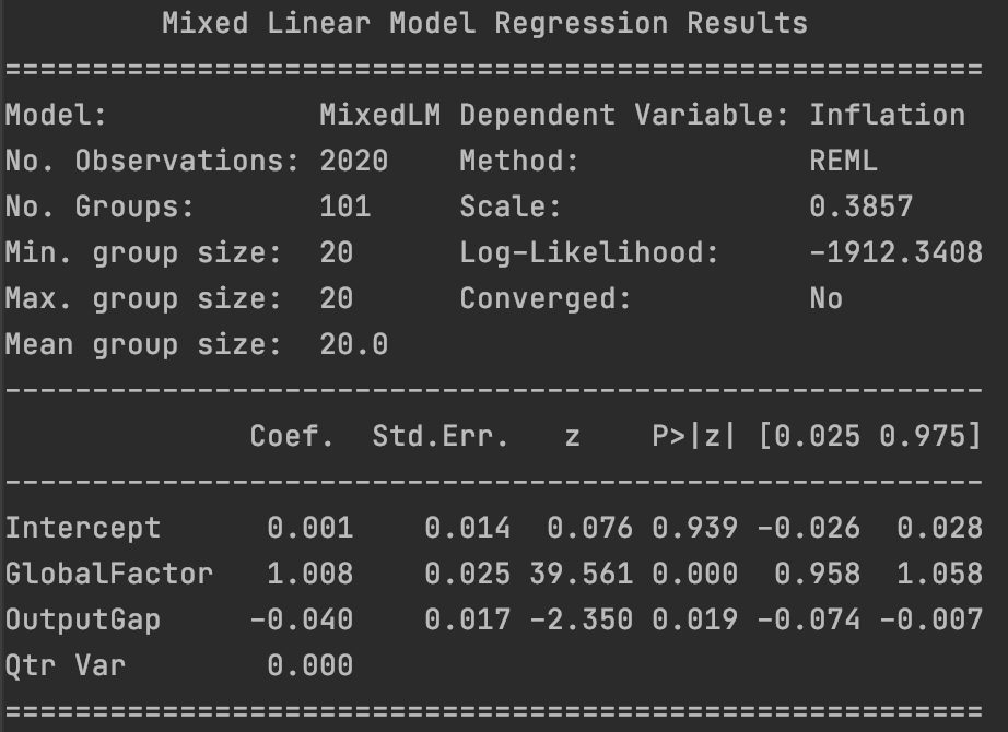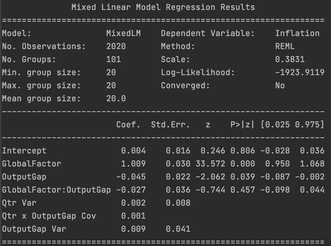 What I would like to do now is show how we can build on these insights to develop a more compelling model of inflation under conditions of intensified globality. Instead of running country-specific regressions, we shall build a hierarchical model of inflation. Before doing that, let’s examine the results of a basic panel regression where we allow random effects by quarter. We use the same dataset as in the previous dispatch. However, we robustly standardize all variables to have zero mean and unit variance to facilitate comparison of the coefficients.