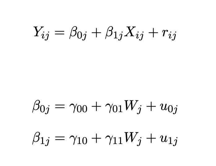 In the general setting of hierarchical modeling, we have a top-level model that relates a response to features of interest, stratified by a grouping variable. The coefficients of the top-level model are allowed to vary by group. In the general linear formulation, Y is a linear function of X within each group j, but the intercepts and the slopes are themselves functions of W, a variable that varies across groups indexed by j as below: