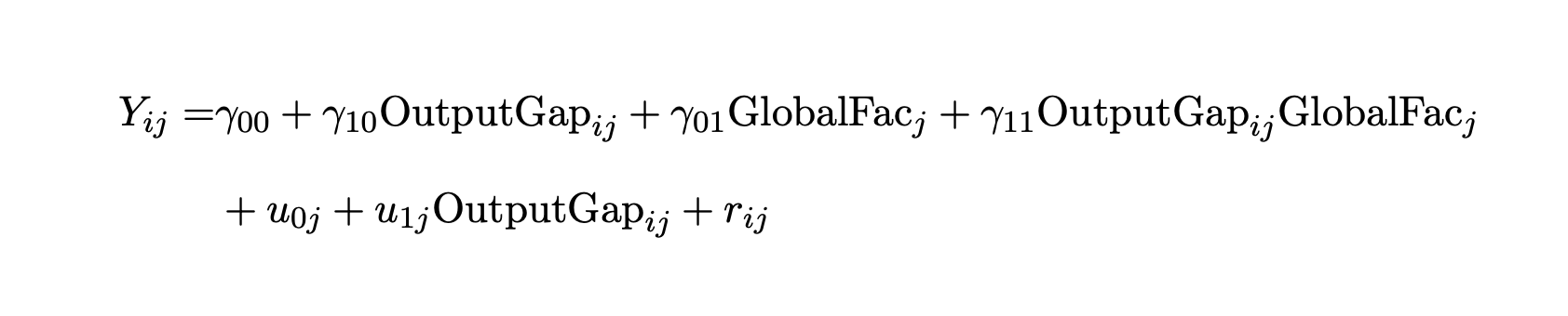 where the error terms are assumed to be homoskedastic and orthogonal to each other (except for the second level where it is possible to admit correlated errors). These equations cannot be estimated by ordinary least squares. But they can reformulated as a mixed-effects model and thereby estimated with suitable algorithms. Specifically, the equations above can be combined to yield the mixed-effects model: