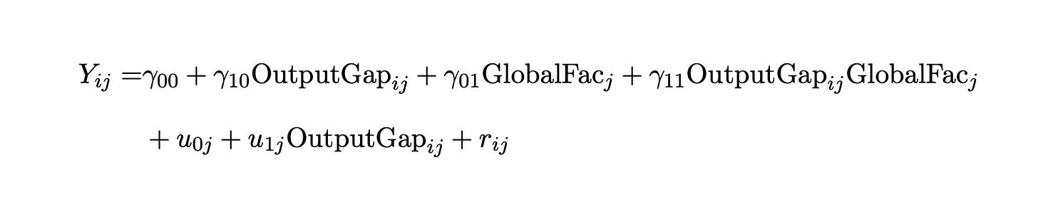 Given this general methodology, we propose the following hierarchical model of inflation in the advanced economies. At the top level, we retain the Standard Model — inflation is modeled as a linear function of the domestic output gap. However, we stratify by quarter, and allow the intercepts and slopes of the Standard Model to vary as a function of the global factor. The interpretation is that the responsiveness of inflation to the output gap depends on global conditions, which we proxy by our global factor — mean AE inflation.