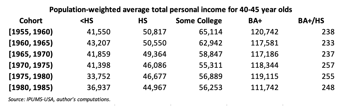 For 40-45 year olds, we find similar declines: 7% for BA, 14% for some college, 12% for HS, and 11% for <HS. The BA-HS ratio has increased 5% from 2.38 to 2.48.