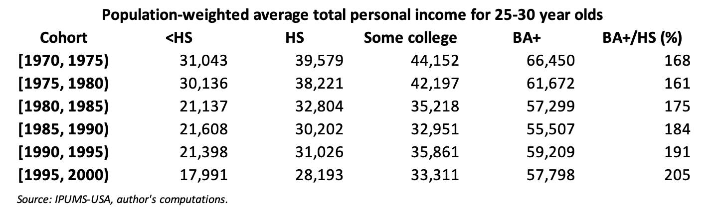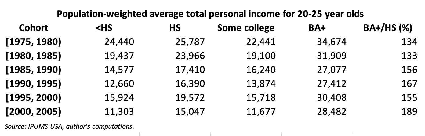 For 20-25 year olds, we find that real incomes have fallen for all educational classes, but they have fallen the most dramatically for those without a college degree. Compared to the 1975-1980 cohort, real incomes have fallen by 18% for those with a college-degree, 48% for those with some college education, 42% for high school graduates, and 54% for those without a high school diploma. The ratio of the incomes of college-educated and high school-educated Americans has increased 41% from 1.34 to 1.89.