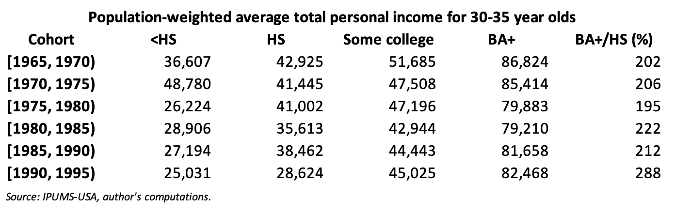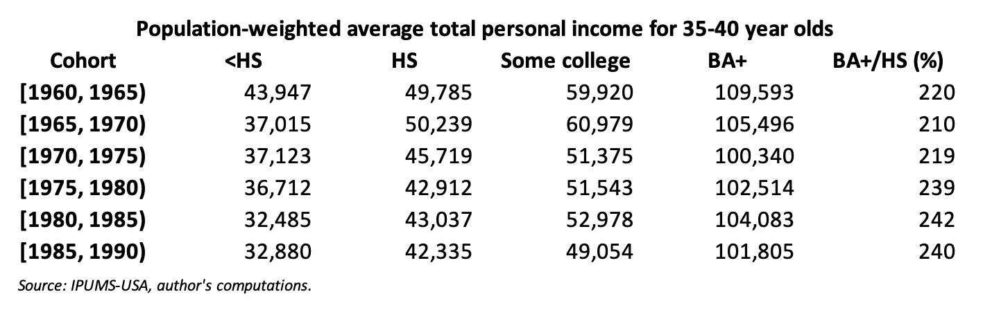 For 35-40 year olds, we find that real incomes have fallen by 4% for BA holders, 16% for those with some college under their belt, 15% for those with a high school diploma, and 19% for those without. The BA-HS ratio has risen 12% from 2.20 to 2.40.
