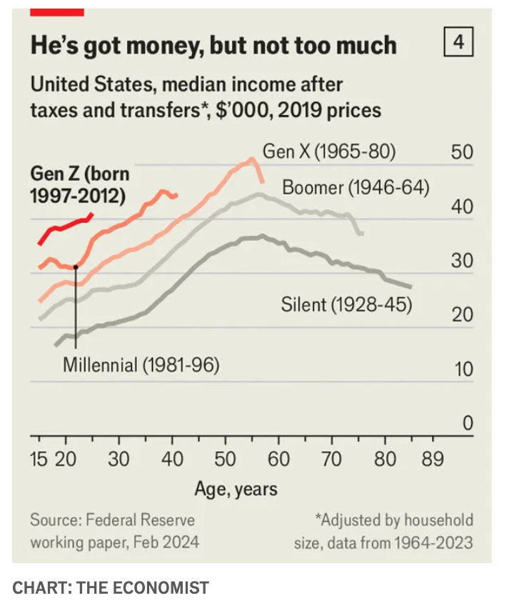 Levitz also cites data from the Survey of Consumer Finances which shows that the median wealth of Americans under 35 in 2022 was the highest on record. He also cites the Economist, which notes that “The typical 25-year-old Gen Z-er has an annual household income of over $40,000, more than 50% above baby-boomers at the same age.”