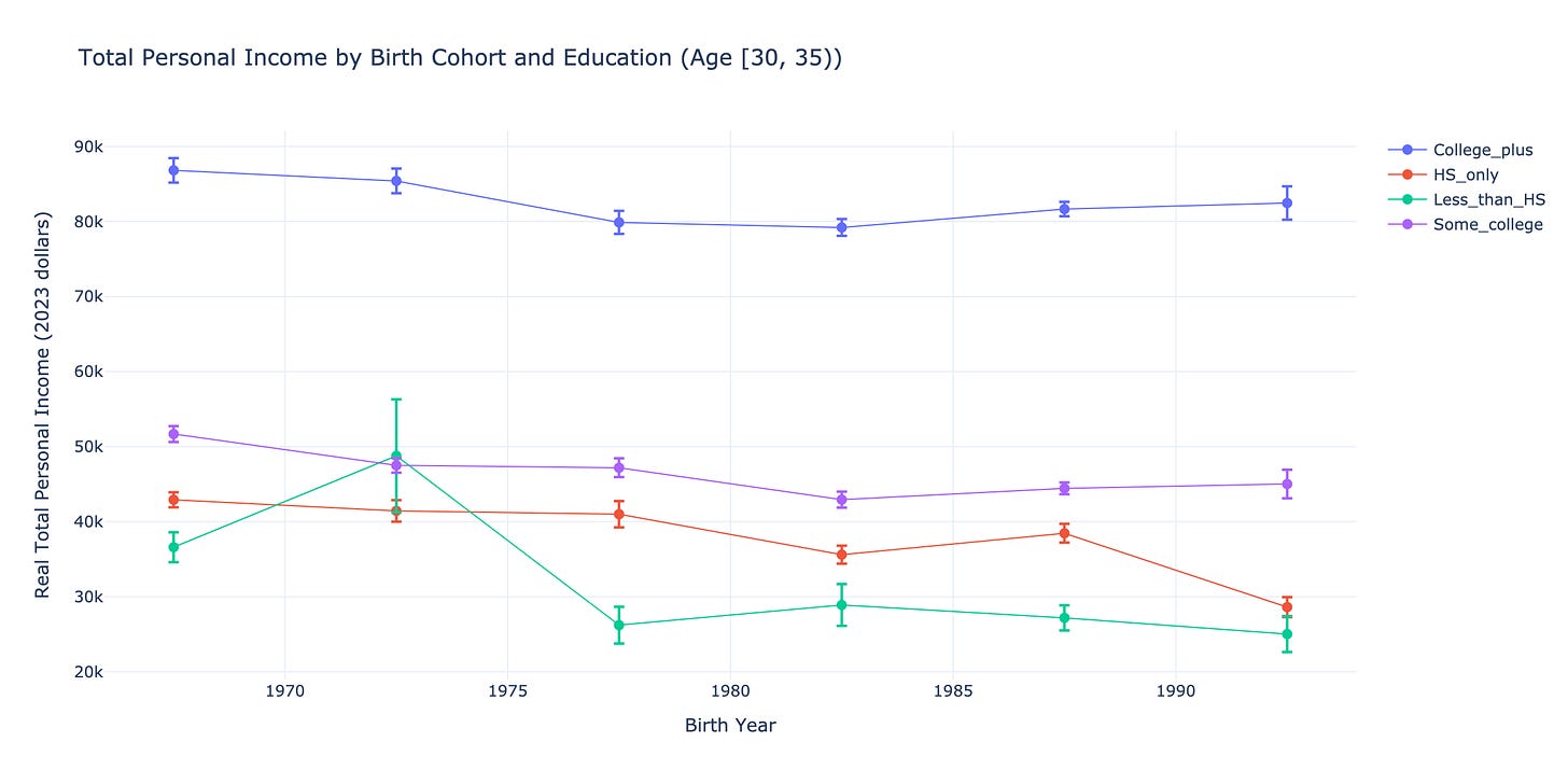 We compute population-weighted means of total personal income by 5-year cohort, 5-year age groups, and educational attainment. This means that, unlike the papers cited above, we are able to track progress or regression by class. We present results by 5-year age groups. For each age group, we look at average incomes by birth cohorts and educational attainment categories.
